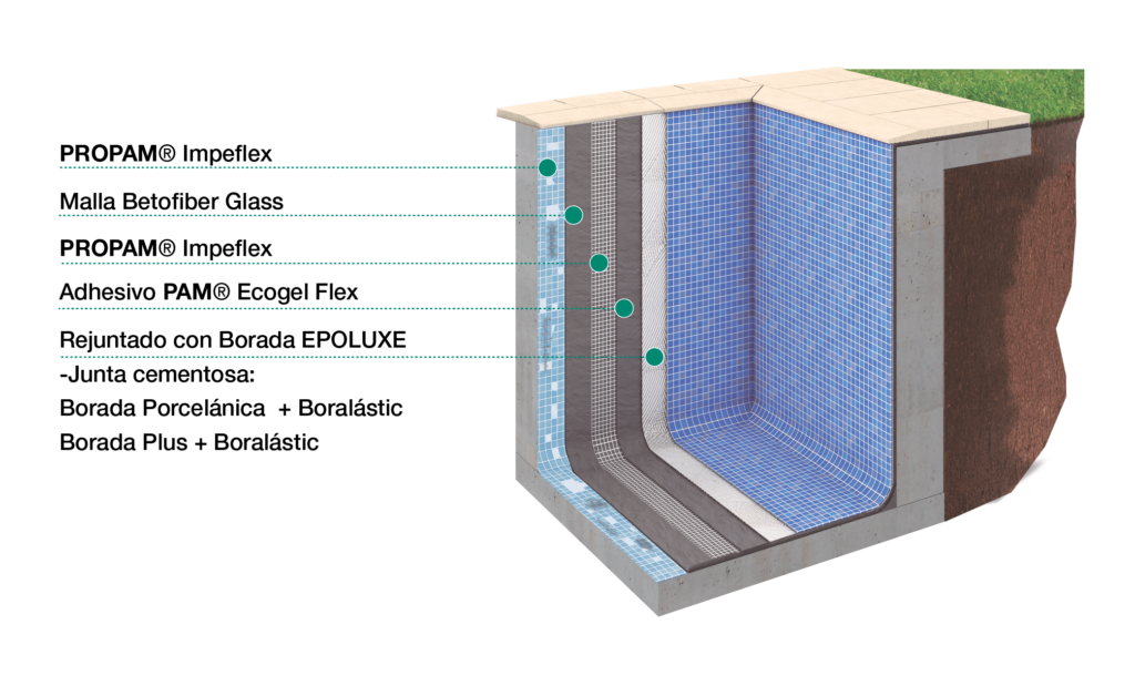 Para asegurar la impermeabilidad en las piscinas apostamos también por FLEXITEC, mortero de gran adherencia y flexibilidad, también capaz de soportar la presión y contrapresión hidrostática y los movimientos producidos por choques térmicos.