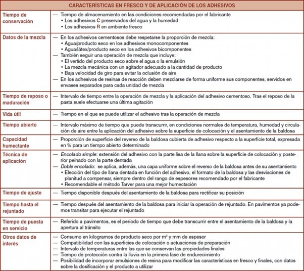 Dans ce tableau, nous vous présentons les caractéristiques de fraîcheur et d’application des adhésifs avec des éléments essentiels tels que : durée de conservation, données de mélange, temps de repos ou de maturation, durée de conservation, temps ouvert, capacité de mouillage, technique d’application, temps jusqu’au jointoiement, temps de mise en service et autres données d’intérêt (Source, Association des fabricants de mortiers et de SATE, ANFAPA).