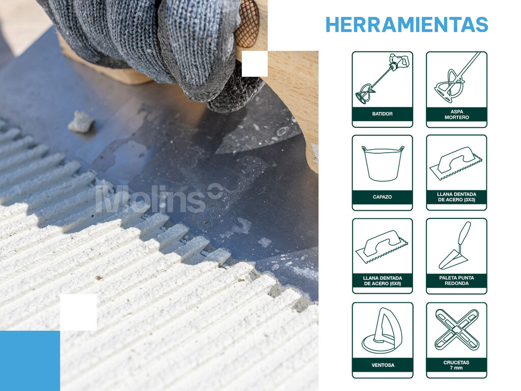 Adhesivo cementoso flexible y deformable en consistencia gel, con bajas emisiones de polvo, con fibras y con elevado contenido en resinas, de tiempo abierto prolongado y resistente al deslizamiento, aplicable en consistencia fluida o en consistencia tixotrópica, para la colocación de todo tipo de baldosas, incluso de gran formato, absorbentes y no absorbentes, en paredes y suelos interiores y exteriores. Recomendado para colocación gran formato.