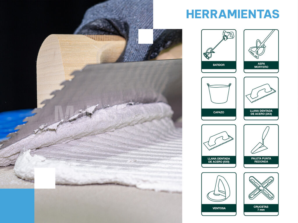 Adhesivo de altas prestaciones con fibras en consistencia gel y bajas emisiones de polvo, para la colocación de todo tipo de baldosas cerámicas.