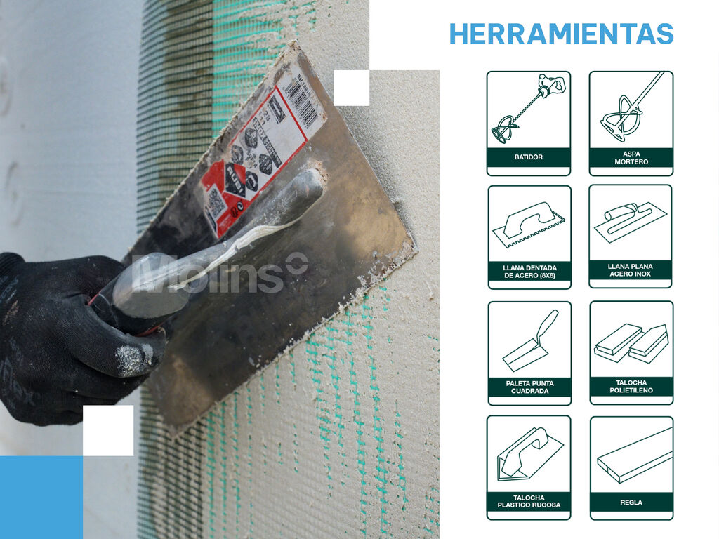 Mortero adhesivo hidrofugado de muy altas prestaciones para la colocación y protección de paneles aislantes en sistemas SATE.