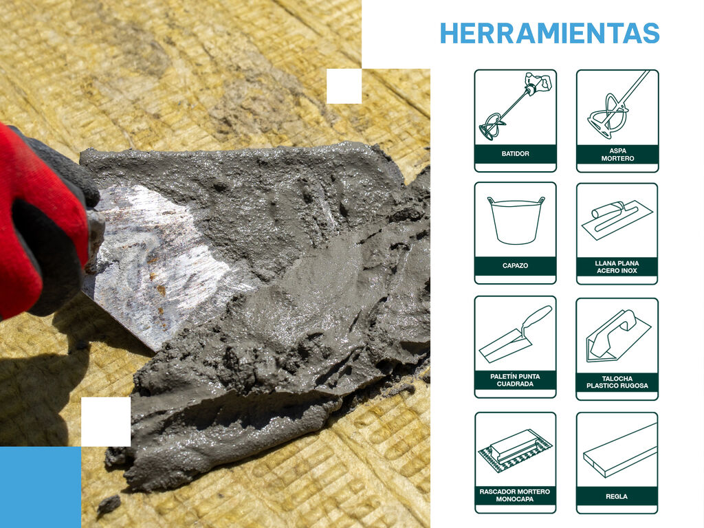 Mortero hidráulico que actúa de recubrimiento adhesivo impermeabilizante. Está formulado a base de cemento, áridos seleccionados, aditivos específicos, y resinas impermeabilizantes.